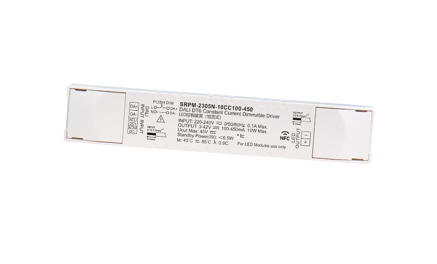 | DALI | 1通道 | 3-42V | 100-450mA via NFC setting; 最低設(shè)置電流檔位間隔低至 0.1mA | 220-240VAC | 最大10W | > 0.93 | 121*22.7*21mm(長*寬*高) |