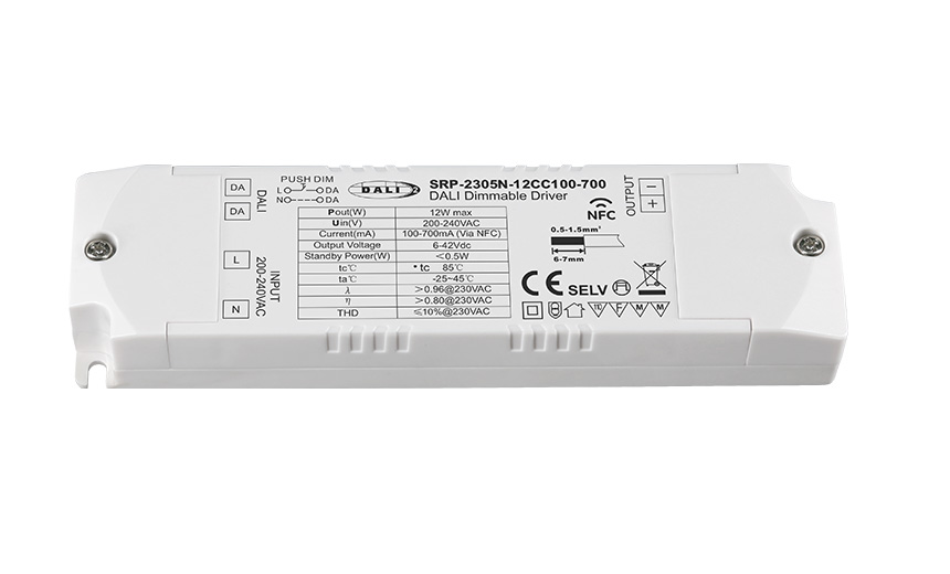 | DALI | 1通道 | 6-42V | 100-700mA via NFC setting; 最低設置電流檔位間隔低至 0.1mA,電流精度低至1% | 200-240VAC/ 176-280VDC | 最大12W | >0.96 | 135*35*20mm(長*寬*高) |