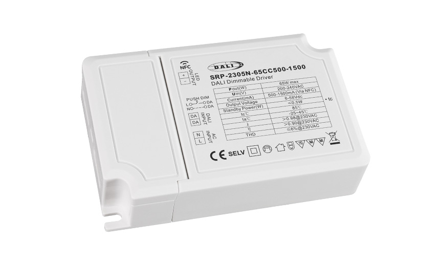 | DALI | 單通道 | 6-54V | 500-1500mA via NFC setting; 最低設(shè)置電流檔位間隔低至 0.1mA,電流精度低至1% | 200-240VAC/ 176-280VDC | 最大65W | >0.98 | 123.9*78.8*30mm(長*寬*高) |