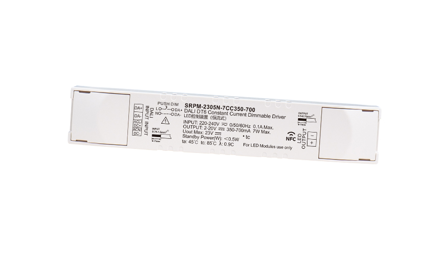 | DALI | 1通道 | 2-20V | 350-700mA via NFC setting; 最低設置電流檔位間隔低至 0.1mA | 220-240VAC | 最大7W | > 0.90 | 121*22.7*21mm(長*寬*高) |